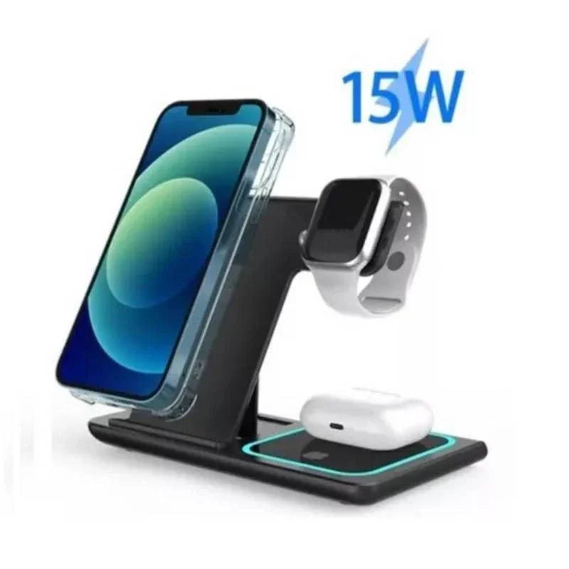 CARGADOR INHALAMBRICO 3 EN 1 TC1005 Cargador para Smartphone (15W), Smartwatch (2,5W) y earphone (3W) de carga inhalambrica.Estación de carga rápida compatible con cualquier dispositivo que contenga carga inalámbrica: Iphone, Android, Samsung, LG, huawei, Apple, Google.Carga Airpods y Airpods Pro, Smartwatch y pencilSistema de enfriamiento, Diseño cómodo y moderno que le permitirá conectar y cargar 4 dispositivos a la vezAlgunas versiones de Smartphone cuyo consumo de energia es alto no permiten que la carga sea simultanea, en esos casos debe despegar el Teléfono para que otros dispositivos carguen.Incluye cable con salido Usb-Usb C, No incluye cuadro cargador.